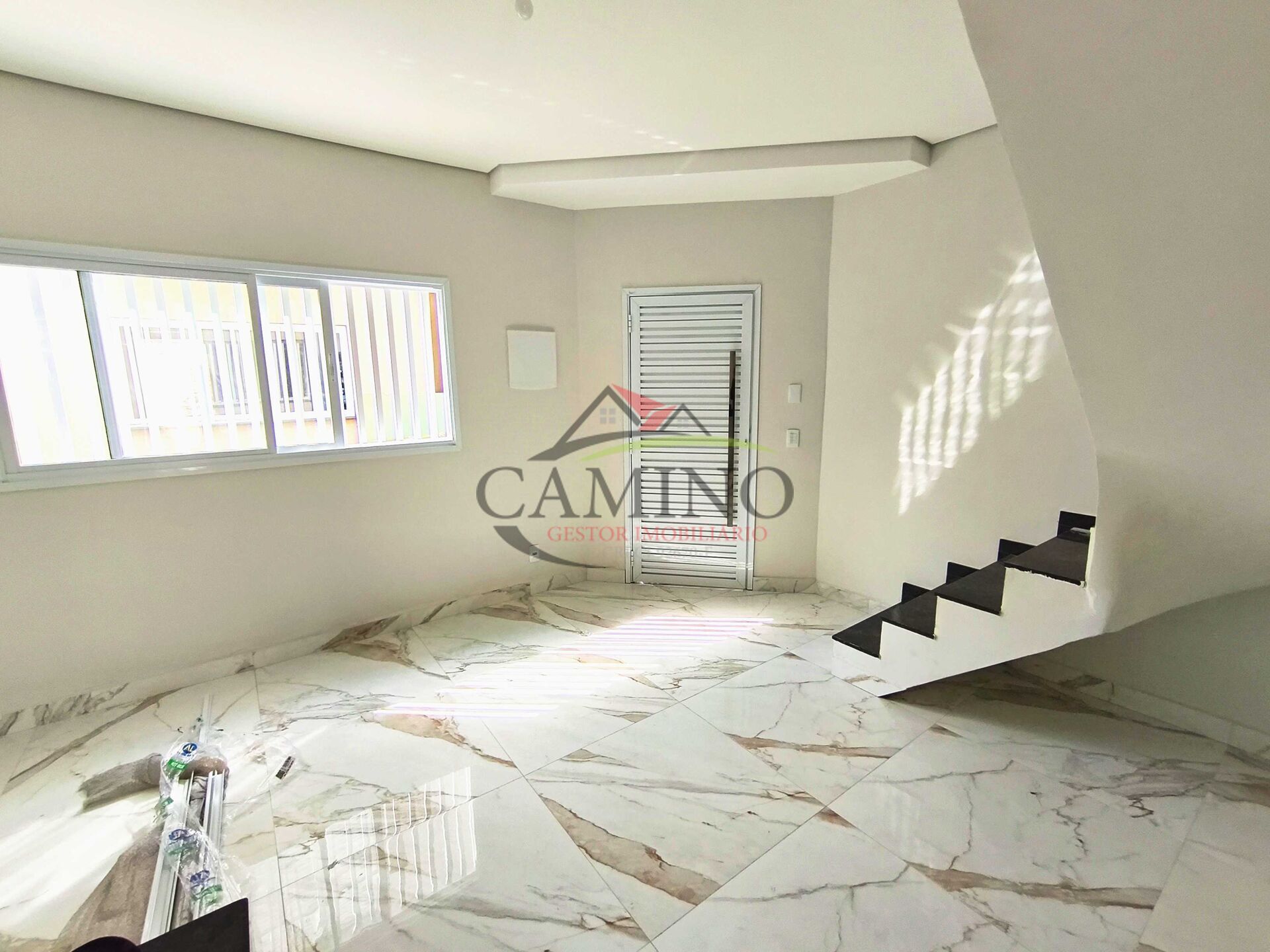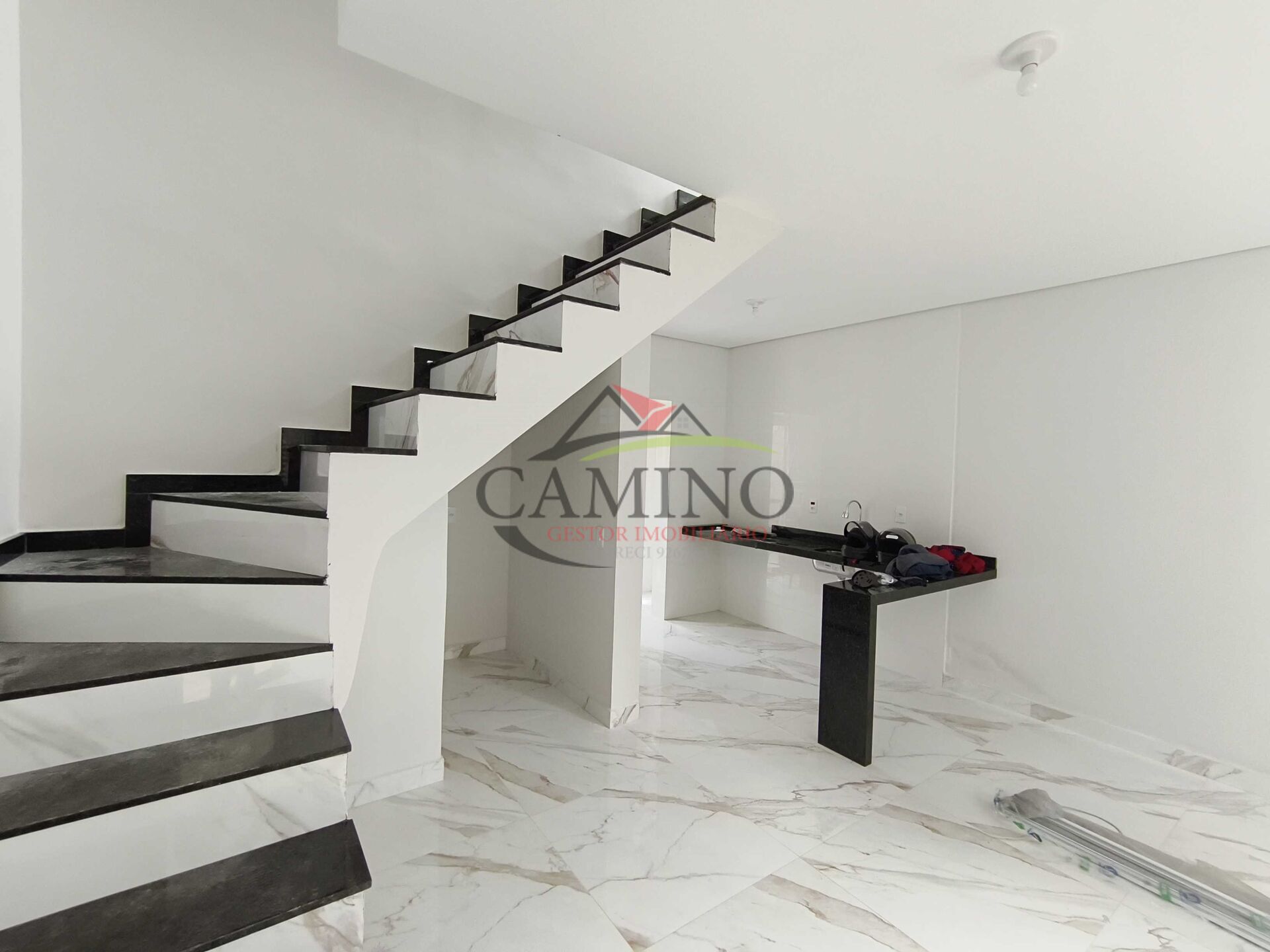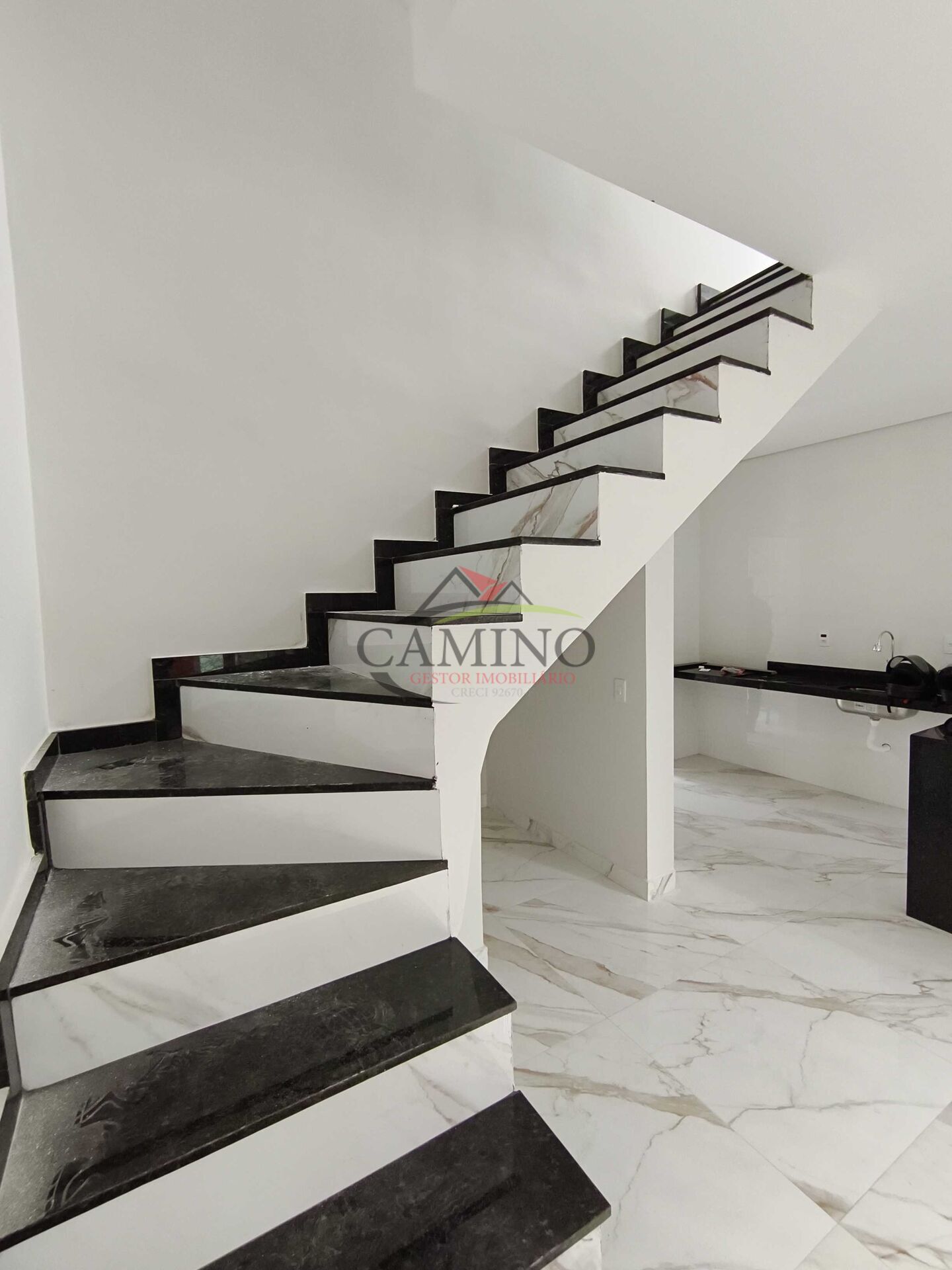 - Escada em mármore com acabamento de porcelanato;